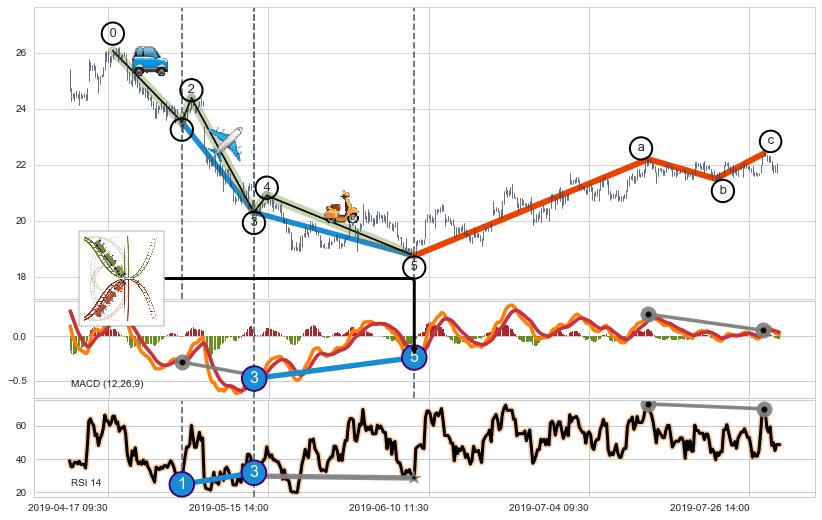 从2019-01-30 14:00至2019-03-08 15:00,共包含143个小时,阶段股价上涨13.69%,阶段股价变动位移路程比: 1 : 8