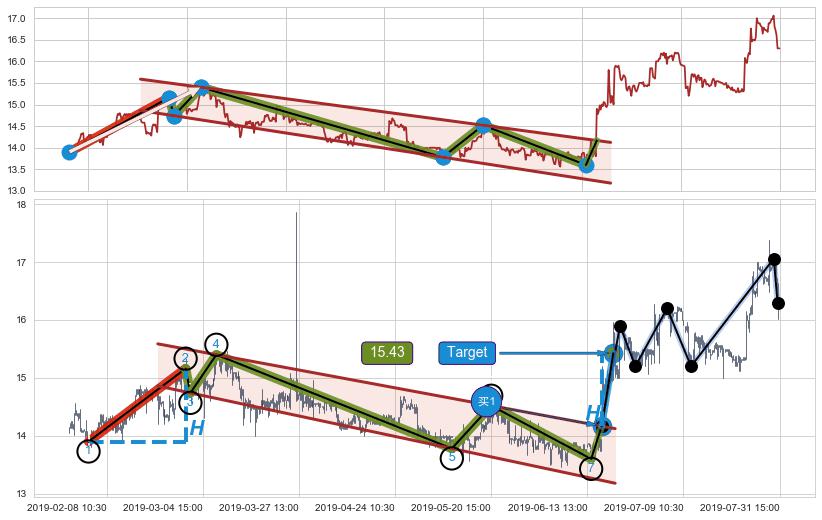 从2019-05-24 14:00至2019-06-14 10:30,共包含82个小时,阶段股价下跌-2.20%,阶段股价变动位移路程比: 1 : 14