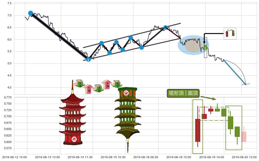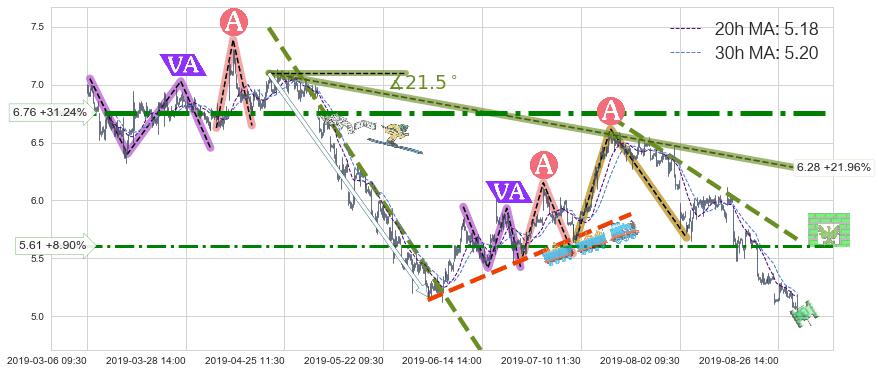 从2019-07-17 11:30至2019-08-29 15:00,共包含190个小时,阶段股价下跌-23.36%,阶段股价变动位移路程比: 1 : 4,下跌趋势角度: 34.7