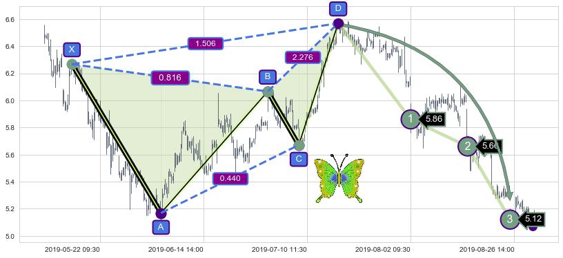 ➣ 已完成【蝴蝶】形态起点X: 05-15:13, 终点D: 07-17:11, 共258交易小时