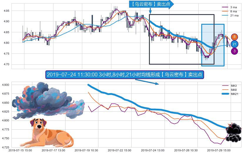 ⚀ 2019-07-18 14:00:00小时-2019-07-29 15:00:00小时显现 3小时-8小时-21小时均线 【乌云密布】卖出点 看空信号,后市看跌,卖出