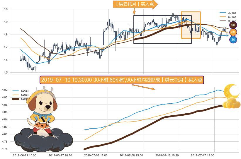 ⚀ 2019-06-28 11:30:00小时-2019-07-18 15:00:00小时显现 30小时-60小时-90小时均线 【烘云托月】买入点 看多信号,后市看涨,买入
