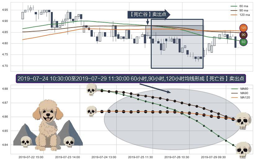 ⚀ 2019-07-24 11:30:00-小时至2019-07-29 11:30:00-小时显现 60小时-90小时-120小时均线 【死亡谷】卖出点 看空信号,后市看跌,卖出