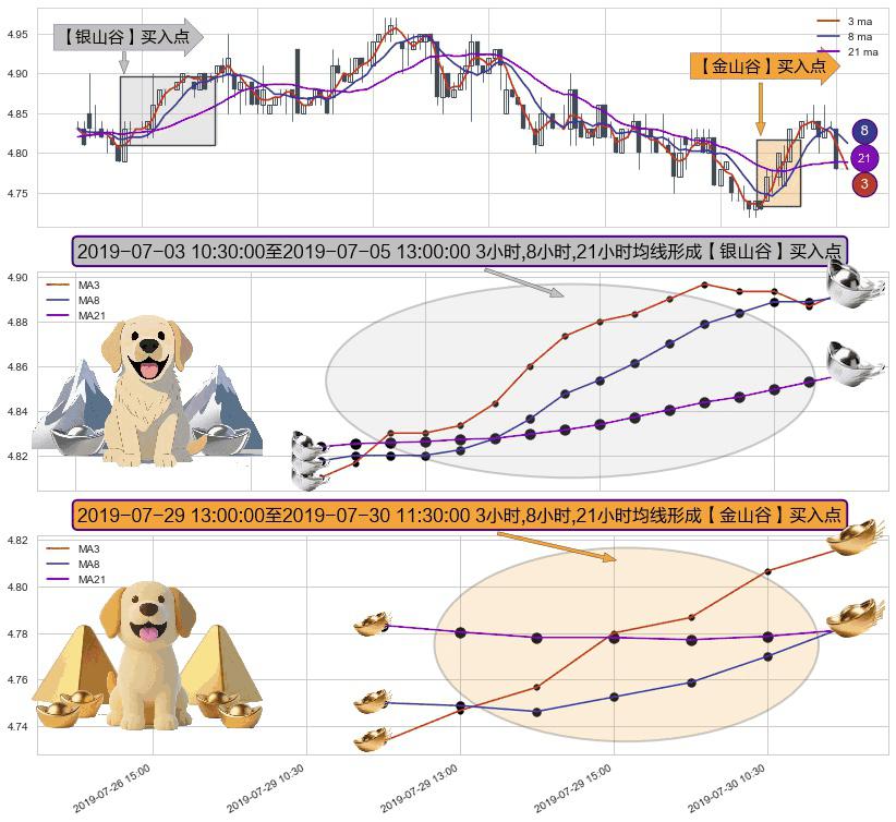 ⚃ 2019-07-29 14:00:00-小时至2019-07-30 11:30:00-小时显现 3小时-8小时-21小时均线 【金山谷】买入点 其再次确认了买入信号,可靠性更强,买入