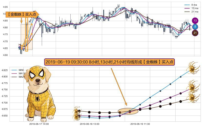 ⚀ 2019-06-19 09:30:00小时显现 8小时-13小时-21小时均线 【金蜘蛛】买入点 看多信号,后市看涨,买入