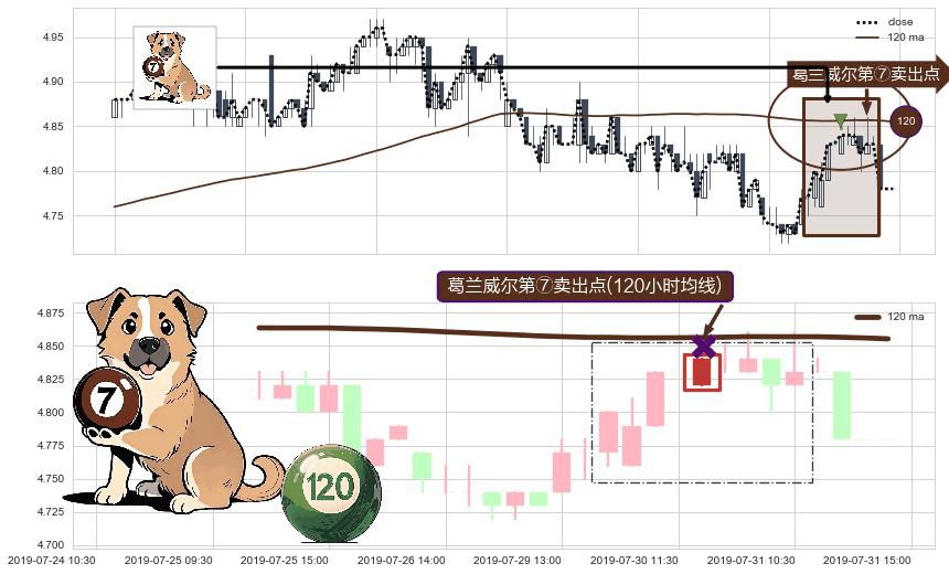 ⚀ 2019-07-30 13:00:00-小时显现 葛兰威尔均线 120小时均线 第⑦卖出点 下降趋势的中继信号,后市看跌,卖出信号