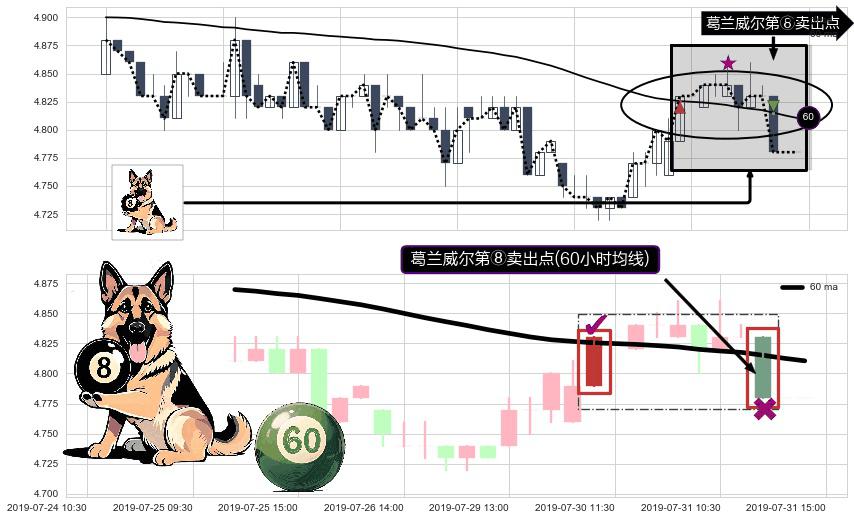 ⚀ 2019-07-31 13:00:00-小时显现 葛兰威尔均线 60小时均线 第⑧卖出点 下降趋势的中继信号,后市看跌,卖出信号