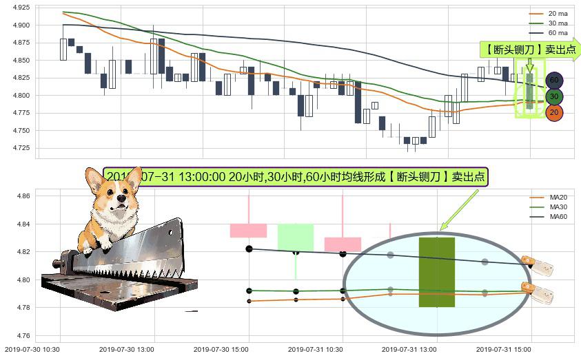 ⚀ 2019-07-31 13:00:00小时显现 20小时-30小时-60小时均线 【断头铡刀】卖出点 看空信号,后市看跌,卖出