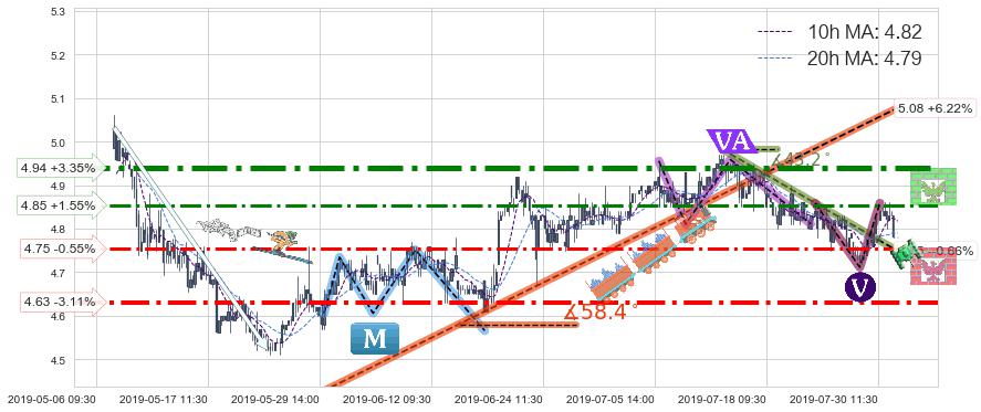 ♘ 阻力价格位4.85,可信任强度66.22%,距离最后交易2019-07-31 15:00形成的收盘价格4.78相差 +1.55%
