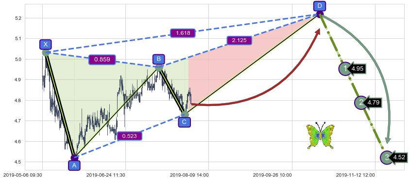 ➣ 未完成【蝴蝶】形态起点X: 05-07:11, 已到达C点: 07-29:09, 预测最终D点: 10-11:11, 共652交易小时