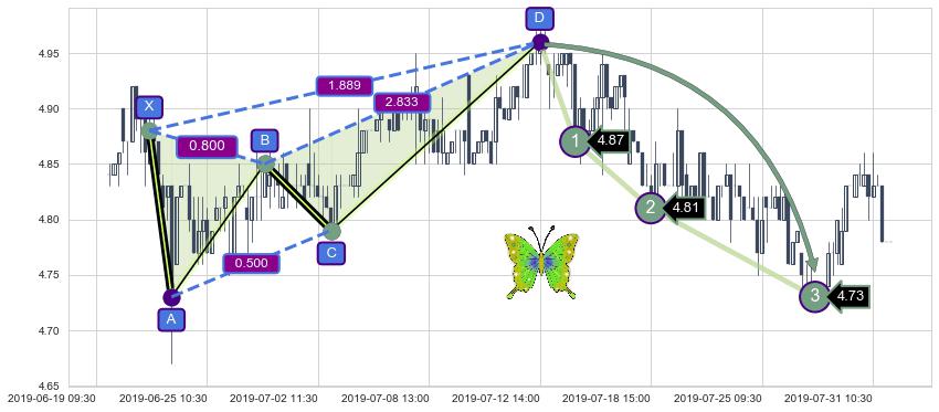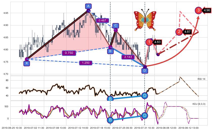➣ 已完成【蝴蝶】形态起点X: 06-21:09, 终点D: 07-12:14, 共89交易小时