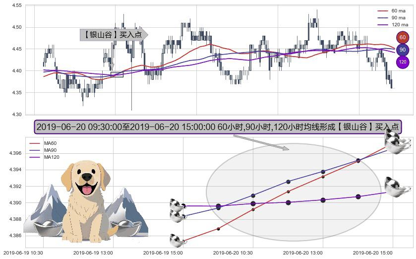 ⚀ 2019-06-20 10:30:00-小时至2019-06-20 15:00:00-小时显现 60小时-90小时-120小时均线 【银山谷】买入点 看多信号,后市看涨,买入