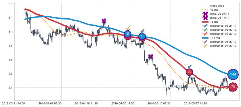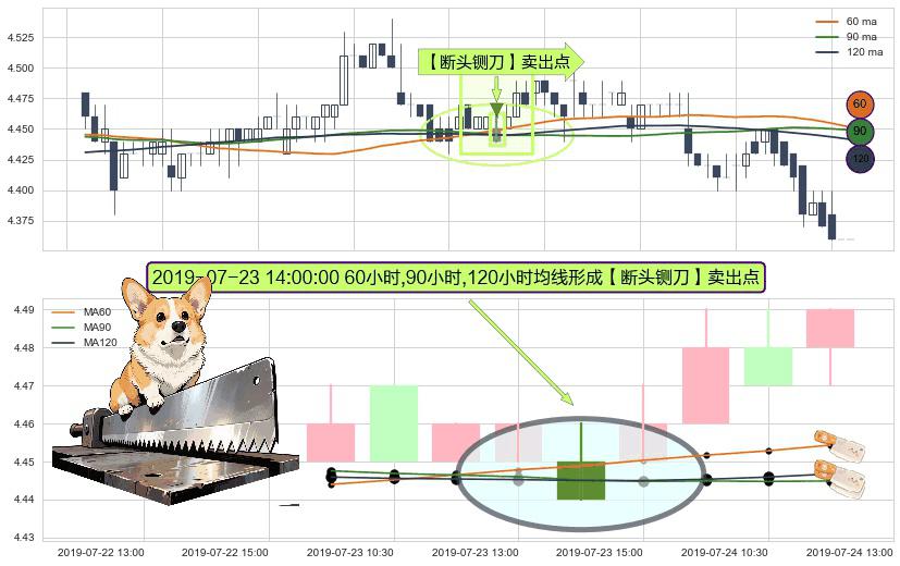 ⚀ 2019-07-23 14:00:00小时显现 60小时-90小时-120小时均线 【断头铡刀】卖出点 看空信号,后市看跌,卖出