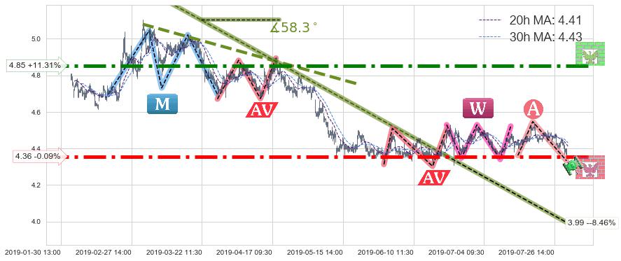 ♘ 阻力价格位4.85,可信任强度95.15%,距离最后交易2019-07-31 15:00形成的收盘价格4.36相差 +11.31%