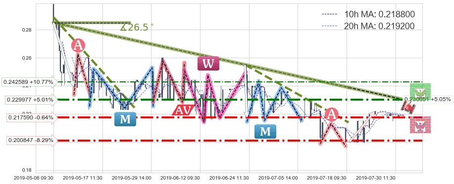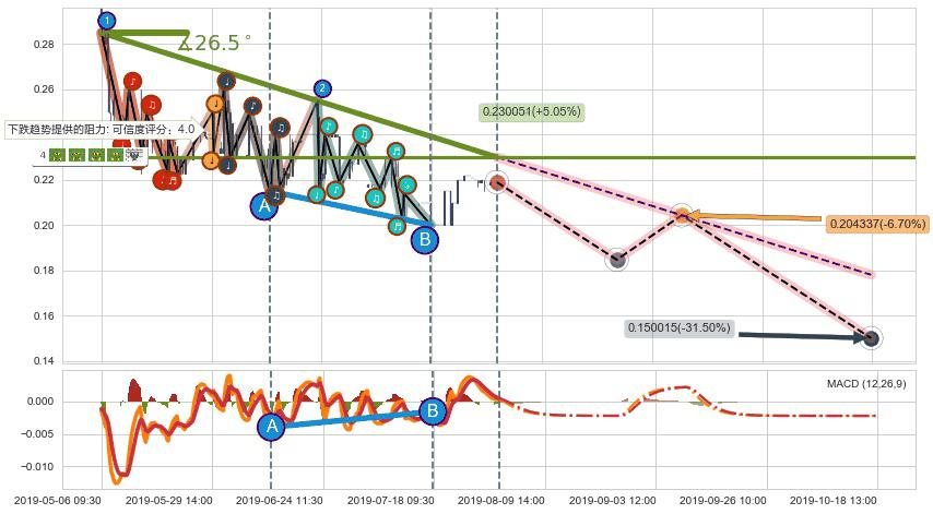 ♘ 在最后的下跌阶段2019-05-06 09:30至2019-07-18 11:30,存在 持续未破位的阻力位 ,阻力价格0.230051,可信任强度83.77%,其距离最后价格0.219000相差 +5.05%