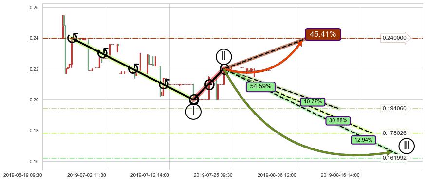 从2019-07-22 15:00至2019-07-31 15:00,共包含43个小时,阶段股价上涨9.32%,阶段股价变动位移路程比: 1 : 1.5