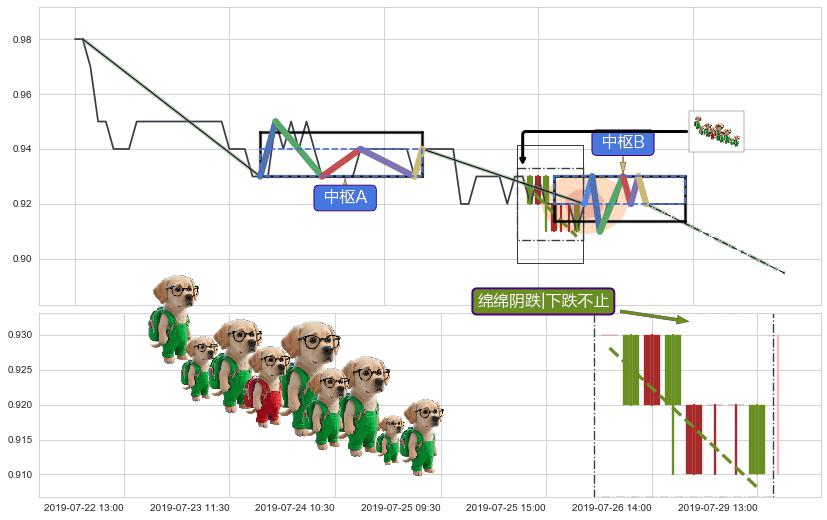 ➢ 【中枢B】:07-29:14-07-31:09,中枢由7笔构成,共9交易小时, ZG=0.9300, ZD=0.9200