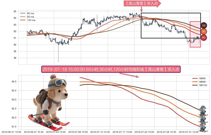 形态多维评估: ⚀ 2019-07-05 14:00:00小时-2019-07-31 15:00:00小时显现 60小时-90小时-120小时均线 【高山滑雪】买入点 看多信号,后市看涨,买入
