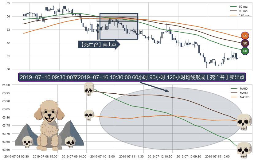 形态多维评估: ⚀ 2019-07-10 10:30:00-小时至2019-07-16 10:30:00-小时显现 60小时-90小时-120小时均线 【死亡谷】卖出点 看空信号,后市看跌,卖出
