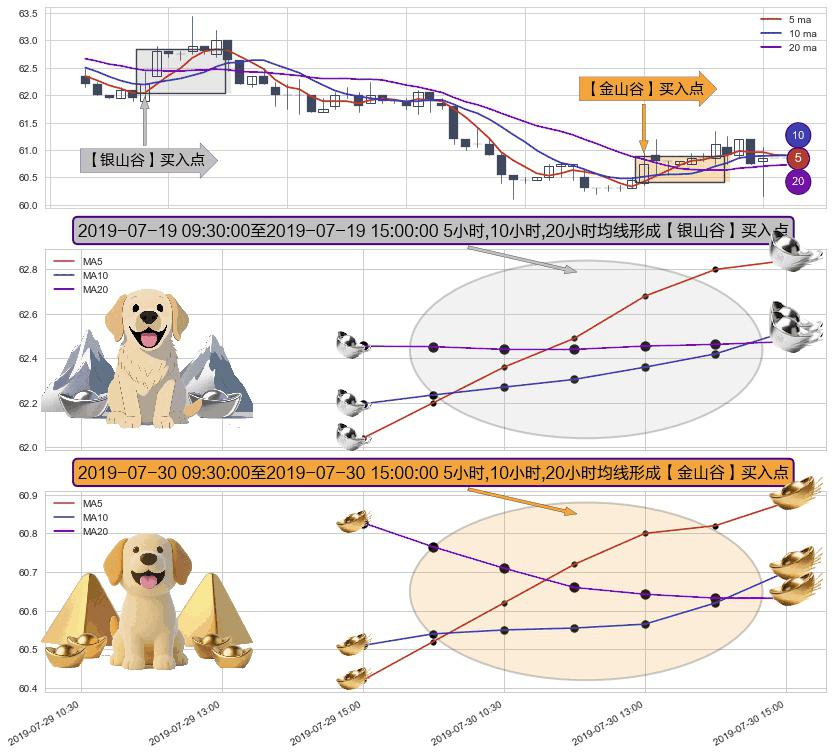 形态多维评估: ⚀ 2019-07-30 10:30:00-小时至2019-07-30 15:00:00-小时显现 5小时-10小时-20小时均线 【金山谷】买入点 其再次确认了买入信号,可靠性更强,买入