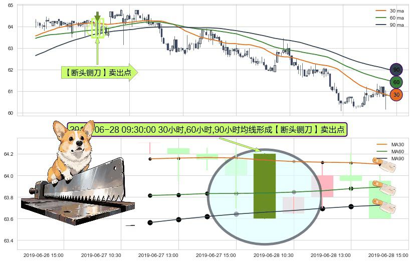 形态多维评估: ⚀ 2019-06-28 09:30:00小时显现 30小时-60小时-90小时均线 【断头铡刀】卖出点 看空信号,后市看跌,卖出