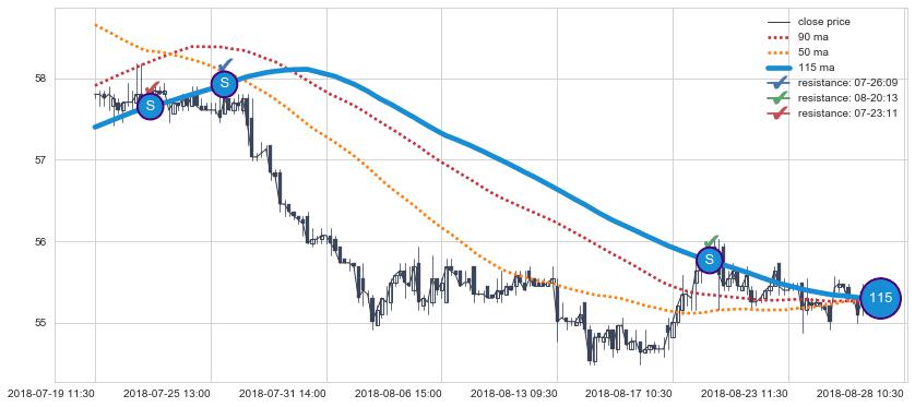 下跌趋势07-19 11:30-08-28 10:30,均线115确认关键阻力3处