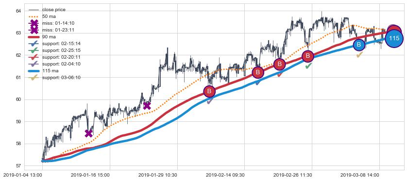 上涨趋势01-04 13:00-03-11 13:00,均线90, 115确认关键支撑5处