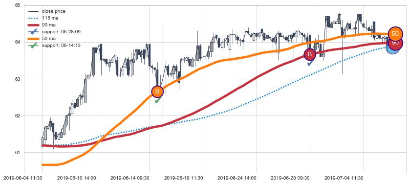 上涨趋势06-04 11:30-07-05 15:00,均线90, 50确认关键支撑2处