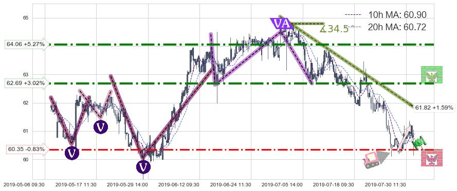 ♘ 阻力价格位62.69,可信任强度82.77%,距离最后交易2019-07-31 15:00形成的收盘价格60.85相差 +3.02%