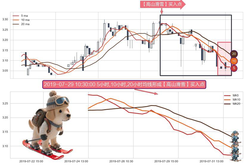 形态多维评估: ⚀ 2019-07-24 13:00:00小时-2019-07-31 15:00:00小时显现 5小时-10小时-20小时均线 【高山滑雪】买入点 看多信号,后市看涨,买入