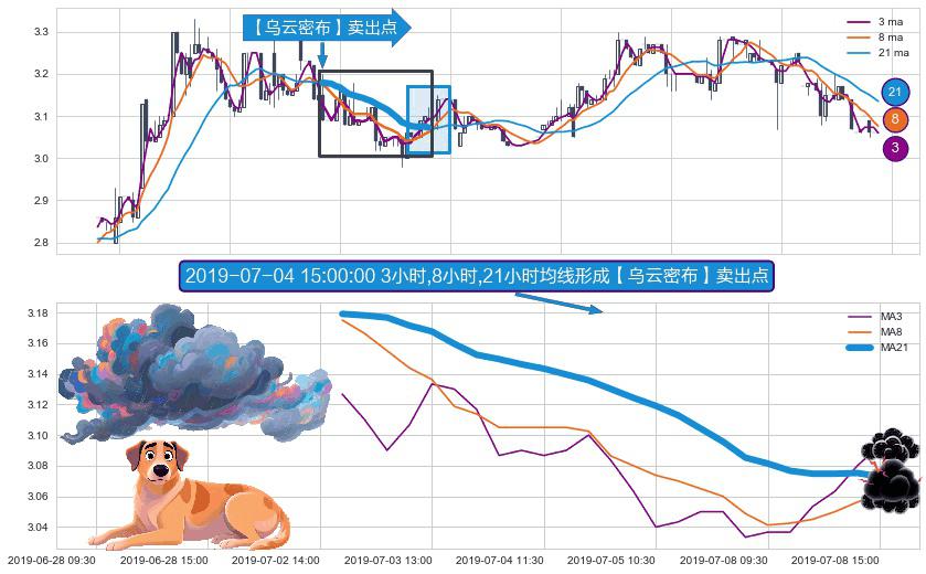 形态多维评估: ⚀ 2019-07-02 15:00:00小时-2019-07-08 15:00:00小时显现 3小时-8小时-21小时均线 【乌云密布】卖出点 看空信号,后市看跌,卖出