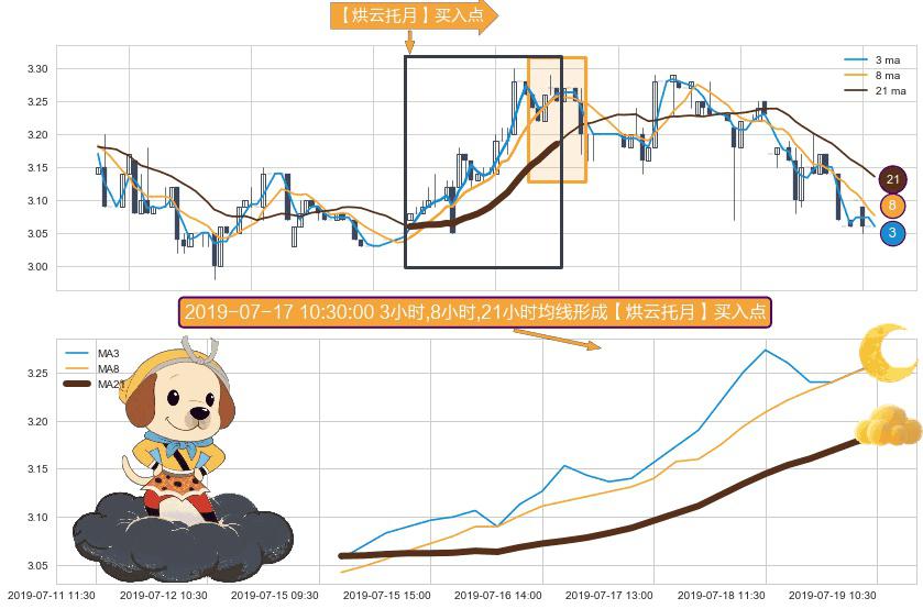 形态多维评估: ⚀ 2019-07-15 10:30:00小时-2019-07-19 10:30:00小时显现 3小时-8小时-21小时均线 【烘云托月】买入点 看多信号,后市看涨,买入