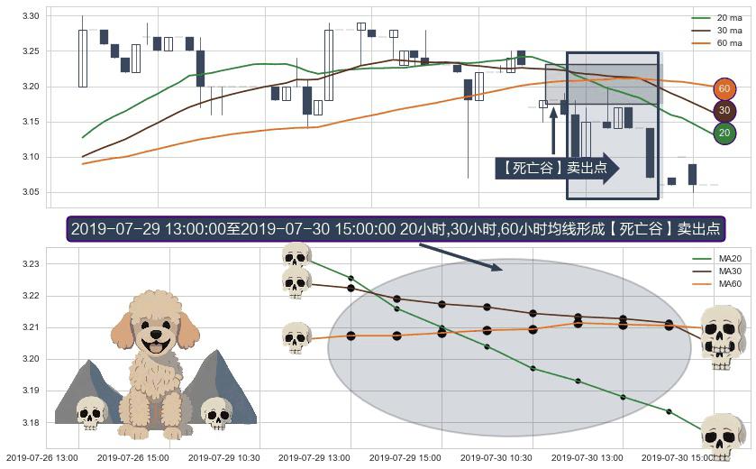 形态多维评估: ⚀ 2019-07-29 14:00:00-小时至2019-07-30 15:00:00-小时显现 20小时-30小时-60小时均线 【死亡谷】卖出点 看空信号,后市看跌,卖出