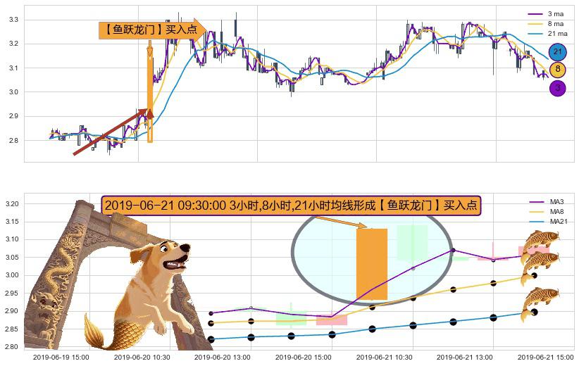 形态多维评估: ⚀ 2019-06-21 09:30:00小时显现 3小时-8小时-21小时均线 【鱼跃龙门】买入点 看多信号,后市看涨,买入