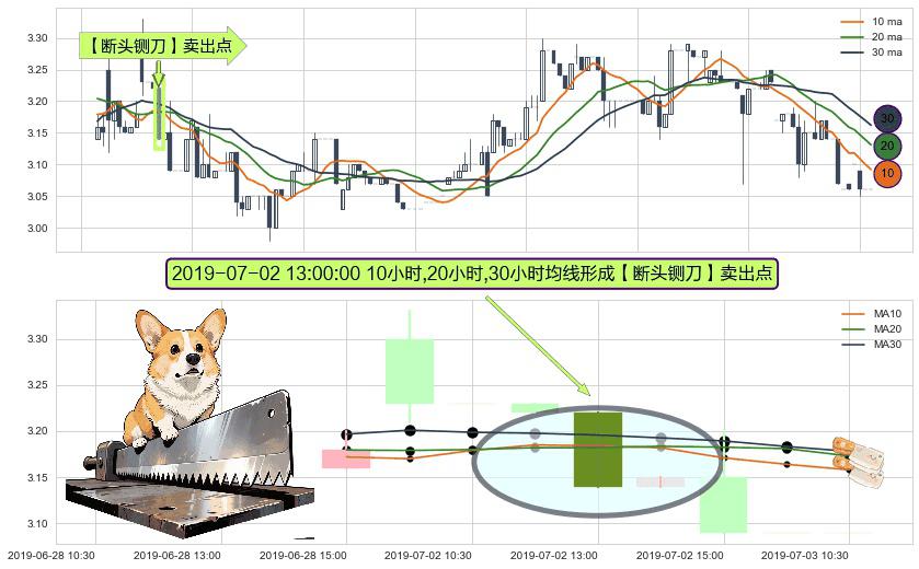 形态多维评估: ⚀ 2019-07-02 13:00:00小时显现 10小时-20小时-30小时均线 【断头铡刀】卖出点 看空信号,后市看跌,卖出