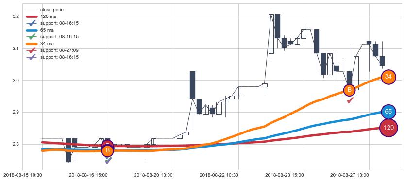 上涨趋势08-15 10:30-08-27 15:00,均线120, 65, 34确认关键支撑2处