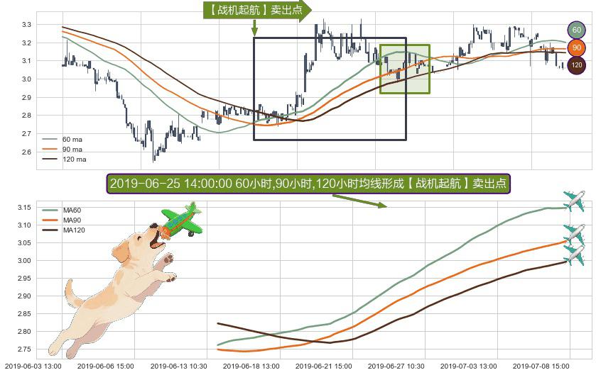 形态多维评估: ⚀ 2019-06-13 14:00:00小时-2019-07-08 14:00:00小时显现 60小时-90小时-120小时均线 【战机起航】卖出点 看空信号,后市看跌,卖出