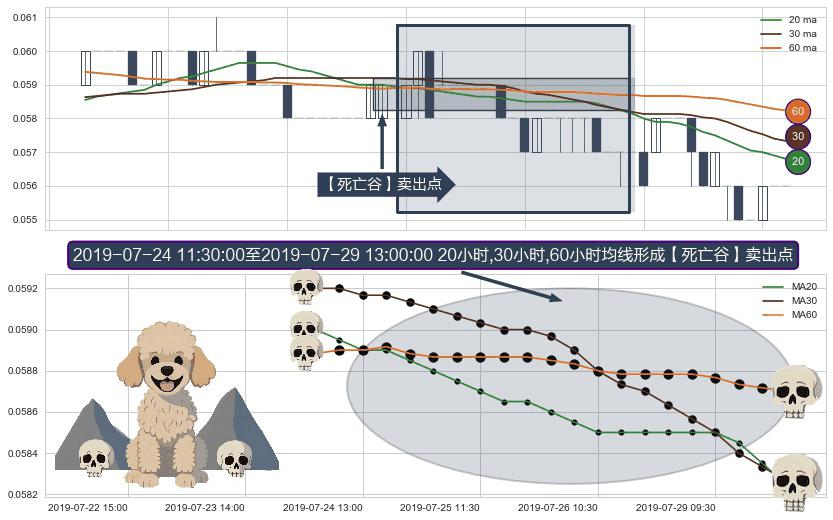 ⚀ 2019-07-24 13:00:00-小时至2019-07-29 13:00:00-小时显现 20小时-30小时-60小时均线 【死亡谷】卖出点 看空信号,后市看跌,卖出