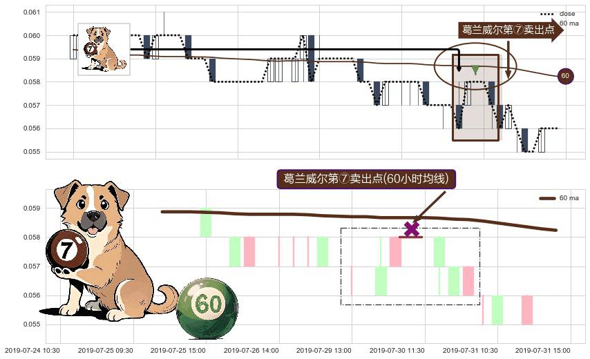 ⚀ 2019-07-30 10:30:00-小时显现 葛兰威尔均线 60小时均线 第⑦卖出点 下降趋势的中继信号,后市看跌,卖出信号