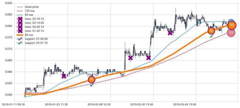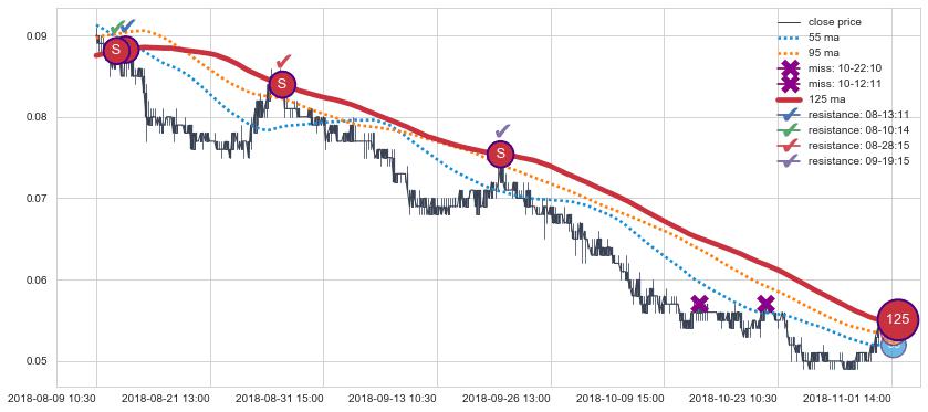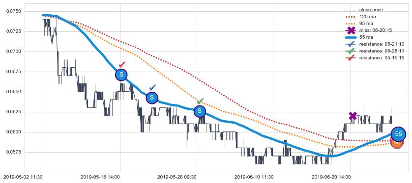 ⚅ 卖点向下突破均线后,价格走势很纠结,不断在均线周围试探,有再次上探突破均线的可能