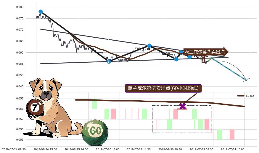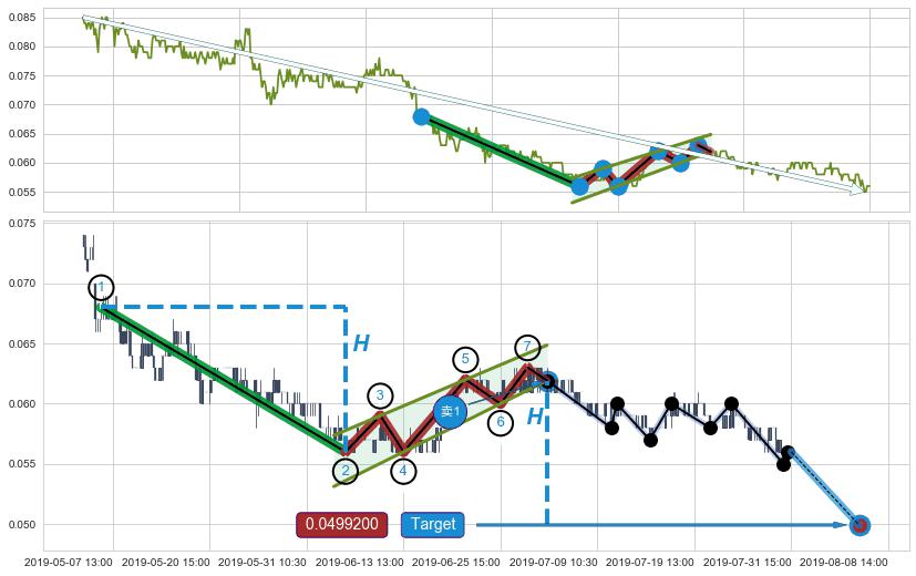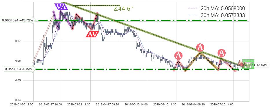 🦴 长线均值回复组合短线趋势跟踪[强阻力信号]2019-02-26 15:00-2019-07-31 15:00下跌趋势依然成立(下跌趋势跟踪依然存在),短线价格略微上行反弹(均值回复猜想),即将接近下跌趋势提供的未破位阻力价格:0.0576951。