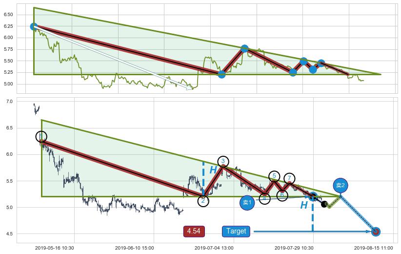 ➣ 【已确认突破】下降三角形整理 起点:05-06:11,突破点:07-29:09,形态共341交易小时