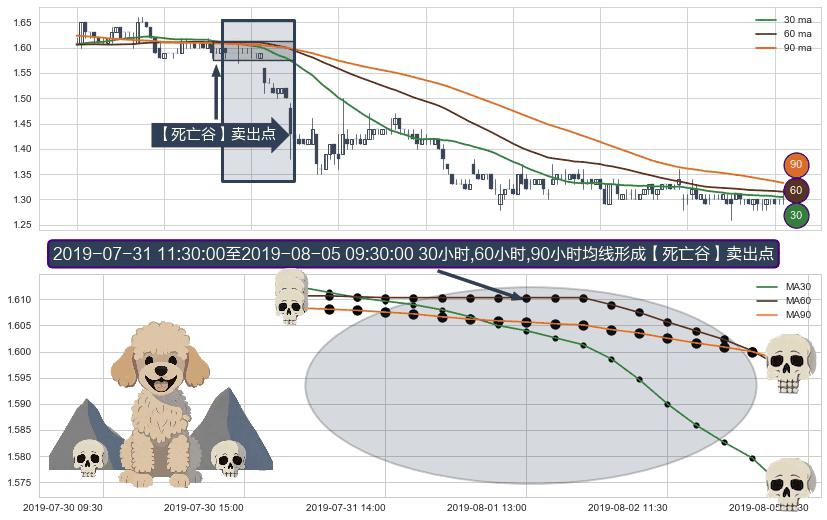 形态多维评估: ⚀ 2019-07-31 13:00:00-小时至2019-08-05 09:30:00-小时显现 30小时-60小时-90小时均线 【死亡谷】卖出点 看空信号,后市看跌,卖出