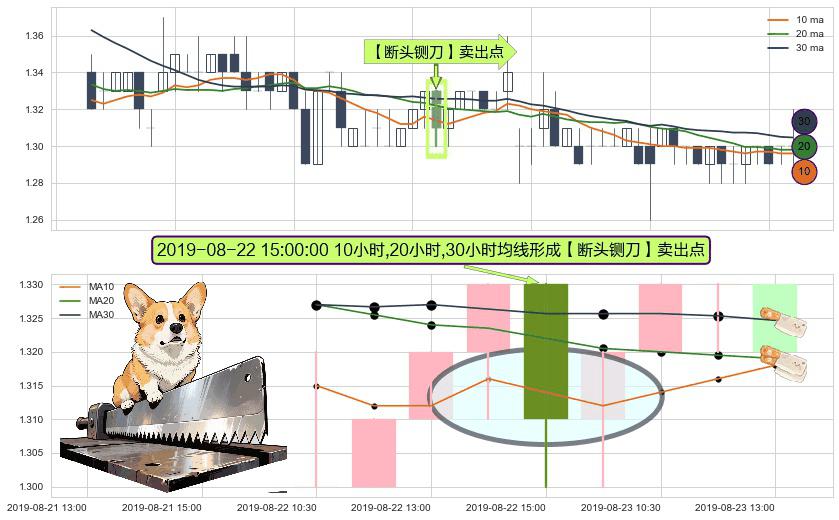 形态多维评估: ⚀ 2019-08-22 15:00:00小时显现 10小时-20小时-30小时均线 【断头铡刀】卖出点 看空信号,后市看跌,卖出