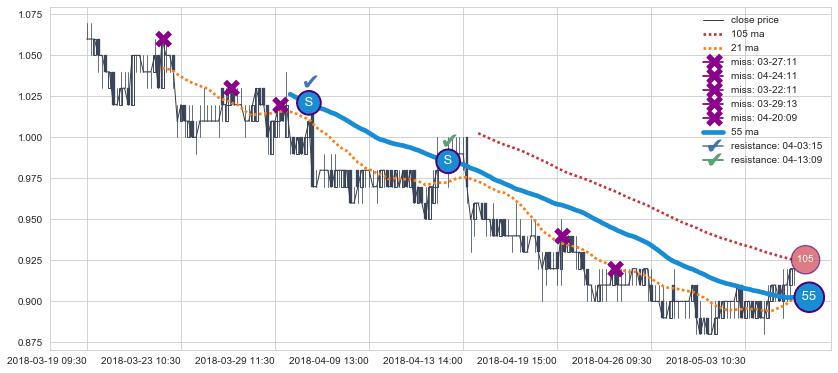 下跌趋势03-19 09:30-05-07 11:30,均线55确认关键阻力2处