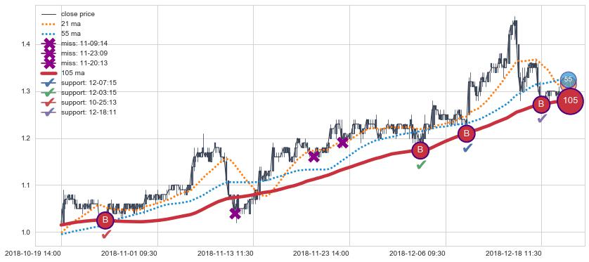 上涨趋势10-19 14:00-12-19 15:00,均线105确认关键支撑4处
