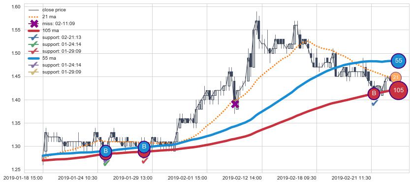 上涨趋势01-18 15:00-02-22 13:00,均线105, 55确认关键支撑3处