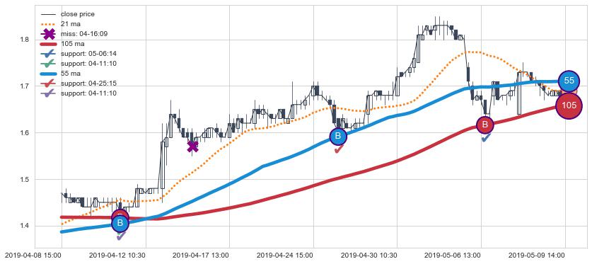 上涨趋势04-08 15:00-05-09 14:00,均线105, 55确认关键支撑3处