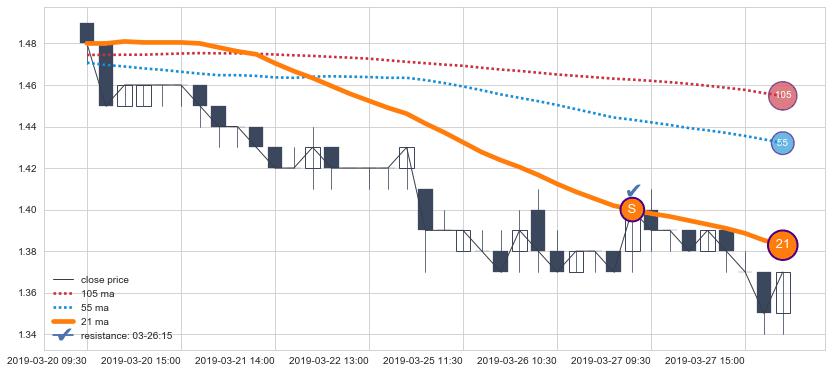 下跌趋势03-20 09:30-03-28 10:30,均线21确认关键阻力1处