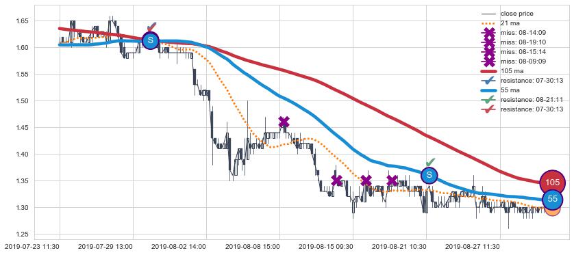 下跌趋势07-23 11:30-08-29 15:00,均线105, 55确认关键阻力2处